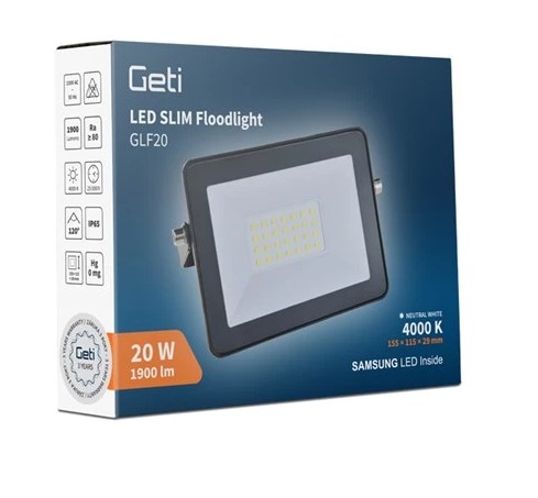 LED reflektor Geti GLF20 20W s kvalitnými SAMSUNG čipmi ponúka svetelný výkon 1900 lm a úsporu energie až 70 %. Ultra tenký SLIM dizajn, krytie IP65 a nastaviteľný držiak zaručujú jednoduchú montáž a spoľahlivé použitie v interiéri aj exteriéri. Prírodná biela farba svetla 4000K a životnosť 25 000 hodín robia z tohto reflektora ideálne riešenie pre dom, garáž, dielňu aj záhradu.